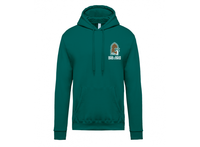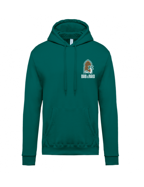 80% coton / 20% polyester. Molleton gratté. Manches montées. Capuche doublée avec cordon de serrage ton sur ton. Poches Kangourou. Finition bord-côte bas de manches et de vêtement.